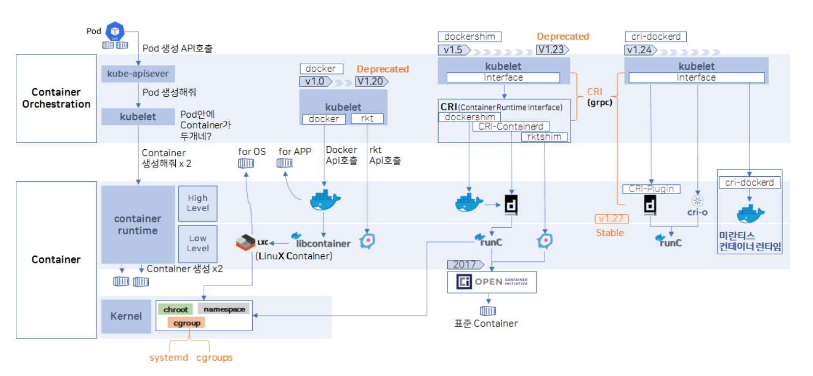 그러면서 쿠버네티스와 컨테이너간의 인터페이스를 통해 유연한 연동을 시작하게 된다. 그것이 CRI ( Container Runtime Interface ) 이다. CRI를 통해 쿠버네티스와 Container들 간에 연동이 유연해졌고 또한 OCI에서 표준 컨테이너를 위한 스펙을 정한다. 그래서 많은 컨테이너들이 OCI 표준에 맞춘 컨테이너를 개발하기 시작함. OCI의 표준을 기준 Low Level Container Runtime중 대표중 하나는 runC가 있다. 그래서 OCI의 표준을 맞춘 컨테이너는 다른 컨테이너에서도 동작을 한다.